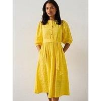 Barbour Heidi Midi Dress Size & Fit True to size - order your usual size Regular fit Midi length Available in sizes 8 - 18 Details Heidi Midi Dress by Barbour Yellow 3/4 length sleeves Tie belt Round neck shape Button front fastening Textured cotton composition Material & Care Material Content: Outer: 100% Cotton Lining: 100% Cotton Washing Instructions: Machine Washable
