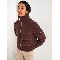 Barbour International Bintl Hudson Faux Velvet Puffer Jacket Size & Fit True to size - order your usual size Regular fit Available in sizes 8 - 18 Details Bintl Hudson Faux Velvet Puffer Jacket by Barbour International Red Faux velvet Padded Funnel neck Zip fastening Long sleeves Side pockets Material & Care Material Content: Outer: 100% Polyester Inner: 100% Polyester Washing Instructions: Machine Washable