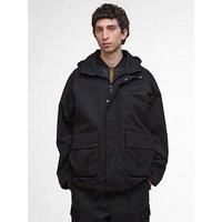 Barbour Re-Engineered Waded Spey Hooded Showerproof Jacket Size & Fit True to size - order your usual size Regular fit Available in sizes S - 2XL Details Re-Engineered Waded Spey Hooded Showerproof Jacket by Barbour Black Crafted with showerproof fabric Detachable hood Generous bellow pockets with flap and popper fastening Barbour pull-ring zip closure with popper fastening storm flap Long sleeves with adjustable cuffs
