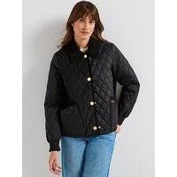Barbour Marla Quilted Jacket Size & Fit True to size - order your usual size Regular fit Regular length Available in sizes 8 - 18 Details Marla Quilted Jacket by Barbour Black Quilted fabric Large cord collar Popper fastening Side patch pocket Long sleeves with woven cuffs Material & Care Material Content: Main Fabric: 100% Polyamide Inner: 100% Polyester Washing Instructions: Machine Washable