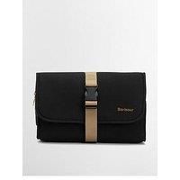 Barbour Transport Hanging Washbag Size & Fit One Size Small Height: 18cm (when closed), widith: 25cm, Depth: 4cm. Details Transport Hanging Washbag by Barbour Black Washbag Tonal stitching Dry Wax Tri fold washbag with hanging hook featuring 3 zip fastening compartments, X 1 of which is removable Fastens together with a webbing strap and clip closure Outer: 100% Cotton Inner Trim: 100% Cotton Contrast shade embroidered logo to outer front