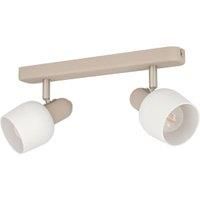 The Eglo Corato ceiling light features a steel ceiling mount in a sandy-coloured finish and two adjustable spotlights each with a white glass lampshade. The pivoting spotlights offer the flexibility to accentuate and highlight specific areas or pieces of furniture within the room allowing you to create your desired atmosphere. The ceiling light blends seamlessly with modern and minimalist interiors providing focused lighting in the living room bedroom hallway and dining room. The product requires 2 x E1...