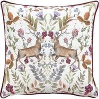 The Mirrored Stag filled cushion features two symmetrical posing stags among vibrant florals, set on a fresh white background. The hand painted watercolour design is printed on poly-linen fabric, with a plush plain velvet reverse, contrasting piped trim and a zip fastening. Ideal for bringing a touch of British nature to your home furnishings. Designed, printed, and made in the UK and made of 96% Polyester 4% Linen this cushion is super soft and durable. - Manufacturers part numbers: MIRRSTAG/CC5/SHI|RPCCMIRROREDSTAGSHIRAZCUSH