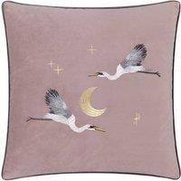 Elevate your living space with the Moonlit Flight Embroidered Velvet Cushion, an exquisite blend of comfort and elegance. Its sumptuous velvet base provides a soft, tactile surface that invites relaxation, while the intricate metallic embroidery adds a touch of sophistication. With majestic storks gliding gracefully across a celestial design of moons and stars, this cushion makes a striking statement, blending artistry with modern style. The contrast piping frames the piece beautifully, giving it a refi...