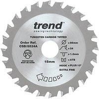 Thin kerf saw blade for cordless saws designed for a professional finish in particle board, plywood, MDF and hardboard. Reamed bore to ensure precise fit to spindle. Silverbraze to ensure tip is bonded securely to body. Trimming Cut Cutting Width (Kerf): 1.2mm Tungsten Carbide-Tipped Teeth Rake Angle: 14 Anti-Kickback Design No Coating Body Hardened & Tempered Laser-Etched Reverse High Grade Alloy Steel Plate Body - Manufacturers part number: CSB8524A