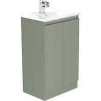 Introducing our stunning double-door floor standing basin unit in a contemporary Sage Green finish. Designed to complement any modern bathroom it adds elegance and creates a sumptuous ambiance. The soft-close doors provide a seamless and ultra-quiet closure. This unit comes with a ceramic basin combining style and functionality. Crafted in the UK with superior quality it is delivered directly within 3 days.