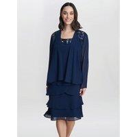 This elegant, navy, mother of the bride/groom dress features a sleeveless scoop neckline with cut-out sequin detailing as the column skirt with colorful ruffles reaches to the knees with a matching long-sleeve jacket and is made of chiffon. Perfect for any special occasion.