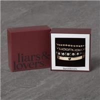 A Liars & Lovers polished mix of gold-tone bangles and chains with crystal accents, presented in a chocolate brown gift box perfect for stacking or gifting. Zinc alloy. Length of bracelet 24cm/9.4in. EAN: 5031830948960.