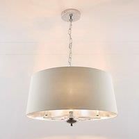A stylish addition to any homes, this three-light drum chandelier is a statement lighting solution for any room. The three lights are housed within a cylinder drum shade, and a polished silver finish add to the chandelier's classic appeal. It is compatible with dimmers and also suitable for sloped ceilings. Shade Colour: Cream, Grey, Navy, Black on the out side, inner is Silver. Bulbs to be used (not included):40 Watt Max 10 Watt Max LED Shade Diameter: 50cmShade Height: 21.5cm (size approx) | K LIVING...