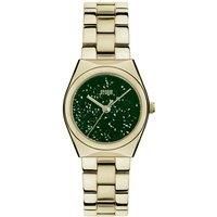 The Azalyn exudes sophistication, featuring a captivating green 3D crystal shimmer dial that adds a touch of elegance. The two-tone brushed and polished stainless steel strap, enhanced with 21k gold plating, offers a modern, versatile look, making it suitable for both day and evening wear. With water resistance up to 50 meters, the Azalyn combines style and practicality effortlessly. - Manufacturers part number: 47547/GD/GN