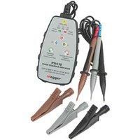 Bicoloured LED display, audible tone and phase indicator for rapid sequence identification. Clockwise rotation is indicated by rotating green LEDs (with a continuous tone), and anti-clockwise rotation by red LEDs (and a warbling tone). Supplied with fused test leads, croc clips and prods. CAT IV 600V Clockwise & Anti-Clockwise Indication Tests up to 500V LED & Audible Tone Dual Phase Colour Identification - Manufacturers part number: PSI410