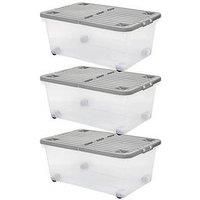 This Wham 45 Litre Box with Wheels and Folding Lid is a sturdy box that is suitable for domestic use at home and professional use at work.The double wheels make this box easy to transport and the reinforced corners offer it extra durability. The split lid allows easier access to the boxes contents. Nesting inside one another when not in use and stackable when they are, opening up plenty of space in the roomThis great value pack comes with three storage boxes suitable for storing garden tools, DIY tools, cleaning products and other items both professional and domestic.. 45 Litre capacity. Pack of 3. Secure lid with clips. Split lid. Stackable. Approximate dimensions (mm) H 250 W 600 D 400*Please note that this product is delivered direct from our supplier and may take a little longer to arrive. - Manufacturers part number: Wham_