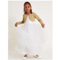 Monsoon Girls Niamh Cardigan - Gold All that glitters is gold! Perfect for some extra warmth on those long occasion days, this piece comes fitted with a single button fastening on the top so they can show off their beautiful outfit. Material & Care Material Content: Cotton 93%, Polyester 7% Washing Instructions: Machine Washable