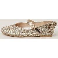 Monsoon Girls Sparkle Bow Ballerina Shoes - Gold Made to dazzle, built to party. Doused in glitter for endless sparkle, these ballerina shoes are the ultimate dancefloor-ready pair. Designed with a glitzy bow at the heel and a secure buckle strap fastening. Material Content: Upper: Polyurethane (PU) 100%, Lining: Polyurethane (PU) 100%, Sock: Polyurethane (PU) 100%, Sole: Thermoplastic Rubber (TPR) 100% Washing Instructions: Wipe Clean
