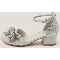 Monsoon Girls Dazzle Bow Heeled Shoes - Silver Let's go twinkle toes! The perfect pair for them to show off as they're walking down the aisle, these heels are designed with a closed toe and topped with a shimmery bow. Finished with a low block heel and secure buckle strap at the ankle for all-day comf Material Content: Upper: Textile 100%, Lining: Polyurethane (PU) 100%, Sock: Polyurethane (PU) 100%, Sole: Thermoplastic Rubber (TPR) 100% Washing Instructions: Wipe Clean
