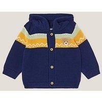 Monsoon Baby Boys Benny Bear Fairisle Knitted Hoody - Green Bear hugs incoming. Keeping your little cub warm and cosy when temperatures start to cool. This button-up hoodie is stitched in soft cotton yarns with green and yellow fair isle stripes. Our favourite part The textured teddy patch on the chest. Material Content: Shell: Cotton 100% Washing Instructions: Machine Washable - Manufacturers part number: WQMBJ