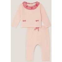Monsoon Baby Girls Penelope Knitted Top & Leggings Set Size & Fit Available in sizes 0-3 months - 12-18 months Details Baby Girls Penelope Knitted Top & Leggings Set by Monsoon Pink Round neck Long sleeve Floral collar Button back fastening Patch pockets with bow detail Elasticated waistband Drawstring fastening Material & Care Material Content: Shell: Cotton 100% Washing Instructions: Machine Washable