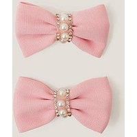 Monsoon Girls 2 Pack Small Bow Pearl Clips - Pink Bow-tiful. Embellished with pearl beads and diamantes, these bows bring subtle shine to their hairstyles. Two included. Warning! Choking Hazard-Small parts. Not suitable for children under 3 years old. Pink Material Content: Composite: Iron 20%, Plastic 20%, Polyester 60% Washing Instructions: Wipe Clean