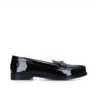 The Snap loafer from Carvela features a black patent upper with a gold horsebit across the front.