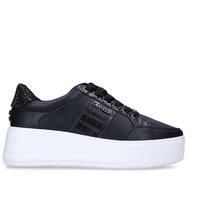 The Jive Lace Up from Carvela features a black detailed upper with a silver branded tab on top. The heel features a black glitter panel with a white chunky sole.