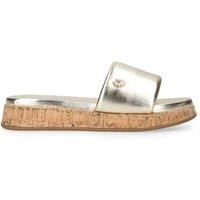The Carvela Cloud Mule features a gold upper with a plush pillow feel. There is a small, Icon C stud on the outer side and the sole features a cork effect. | Carvela Women's 'Cloud Mule' Flats in Gold | Size: 6