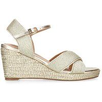 The KG Kurt Geiger Dreya is a wedge heeled sandal with gold rope effect upper. The ankle strap is fastened with gold buckle and features a small KG Kurt Geiger charm. Heel height: 7.5cm. - Manufacturers part number: KG Kurt Geiger_5045656150933