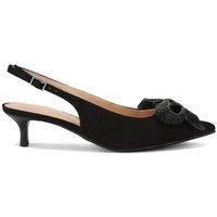 This Asher Sling back heel features a black velvet upper with pointed toe that is finished with a large crystal embellished bow. There is a silver buckle on the ankle strap. - Manufacturers part number: KG Kurt Geiger_5045656973136