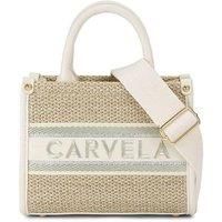 The Mini Glam Beach Tote bag is crafted from a natural raffia with statement stitched branded panel on the panel embellished with crystals. There are bone leather alternative trims.16cm (H), 20cm (L), 8cm (D).Strap length: 124cm.Removable webbed cross body strap. Four gold tone feet. Gold zip closure. Cross body strap. - Manufacturers part number: Carvela_5045657854663