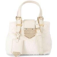 The Carvela Micro Maria Weave bag is a tote bag crafted from a white faux fur. There are metallic gold and leather alternative bone trims and luggage style tag on the front. Dimensions: 14cm (H), 17cm (W), 9cm (D). Strap length: 121cm. - Manufacturers part number: Carvela_5045658174173