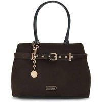 This Gia Belted Tote is crafted from a brown microsuede. There is a statement belt around the bag which is accented with a brushed gold buckle matching the keychain. 26cm (H), 38cm (L), 17cm (D). Strap length: 54cm. Two top handles. Four brushed gold feet. Carvela branded plate on the front of the bag. Can fit phones up to 7inches. | Carvela Women's 'Gia Belted Tote' Suedette Bag in Brown - Manufacturers part number: Carvela_5045658813690