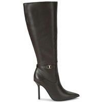 This KG Kurt Geiger Sky High Boot is crafted from a dark brown leather. The ankle reaches just below the knee and there is a simple strap around the ankle with a branded KG Kurt Geiger gold tone chain detail. Heel height: 9cm.