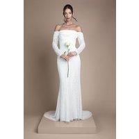 Exquisite sequin-adorned fabric creating a dazzling effect perfect for your special day Elegant Bardot neckline with graceful draped detailing that frames the dcolletage Long sleeves offering sophisticated coverage with a touch of glamour Figure-enhancing silhouette with a floor-sweeping maxi length and subtle train Beautifully structured design that maintains its shape throughout your celebration Make a breathtaking entrance on your wedding day with this show-stopping Coast bridal gown. The stunning Bardot neckline with its artfully draped detail creates a romantic frame for your shoulders, whilst the all-over sequin embellishment catches the light with every movement. The fitted silhouette gracefully follows your curves before gently flaring into a floor-length hem with an elegant train that trails behind you. Style with delicate drop earrings and a sleek updo to showcase the beautiful neckline. Complete your bridal ensemble with ivory satin heels and a simple bouquet to let this mag...