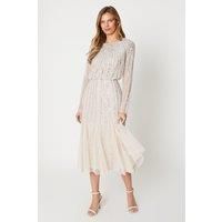 Stunning hand-stitched sequin embellishment in a cascading pattern from bodice to hem Elegant crew neckline and long sleeves for sophisticated coverage Flattering midi length with a graceful flared skirt that moves beautifully Delicate blouson effect at the waist creates a feminine silhouette Fully lined for comfort and a smooth fit against the skin Make an unforgettable entrance in this exquisite Coast sequin midi dress. The hand-stitched sequin detailing creates a mesmerising cascade effect that catches the light with every movement, whilst the blouson waist adds a touch of relaxed elegance to the silhouette. Perfect for cocktail parties and evening soires, this dress requires minimal accessorising - simply pair with strappy heels and delicate drop earrings as shown for maximum impact. The midi length offers versatility for various formal occasions, from upscale restaurant dinners to gallery openings. For cooler evenings, layer with a tailored blazer or wrap without detracting from t...