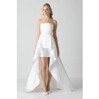 Introducing our exquisite Bandeau Twill Mini With Full Overskirt Wedding Dress, a stunning choice for any bride-to-be. This strapless white dress is crafted from luxurious satin, ensuring a smooth and elegant look. This dress exudes a modern and daring style, perfect for those seeking a unique and fashionable wedding ensemble. Whether you're walking down the aisle or dancing the night away, this dress will make you feel like a true princess.