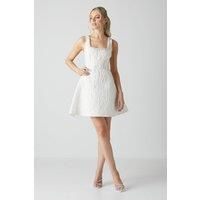 Introducing our Jacquard Full Skirted Mini Dress With Jewel Trim, a stunning addition to any wardrobe. The jacquard fabric adds a touch of luxury, while the full skirt creates a flattering silhouette. The jewel trim detail adds a glamorous touch, making this dress perfect for special occasions or formal events. Embrace timeless style and make a statement with our Jacquard Full Skirted Mini Dress With Jewel Trim.