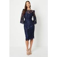 Exquisite Lace Overlay With Intricate Floral Patterns Elegant Boat Neckline For A Refined Look Fluted Sleeves Add A Touch Of Drama And Movement Midi Length For A Sophisticated And Versatile Silhouette Lace Fabric With A Luxurious Satin Finish This Stunning Lace Dress Exudes Sophistication And Elegance, Making It The Perfect Choice For Formal Occasions. The Intricate Floral Lace Overlay, Combined With The Boat Neckline And Fluted Sleeves, Creates A Timeless And Refined Aesthetic. The Midi Length Ensures Versatility, Allowing You To Transition Seamlessly From A Wedding Ceremony To An Evening Reception. Style It With Statement Jewellery And Sleek Heels For A Polished And Glamorous Look That Will Turn Heads Wherever You Go.