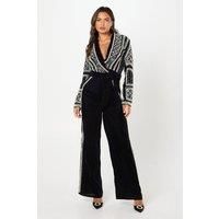 The model looks effortlessly chic in this navy velvet jumpsuit. The jumpsuit features a stunning geometric pattern that adds a touch of modernity to the classic design. With its wide leg and long sleeves, this jumpsuit is both comfortable and stylish. The wrap bodice adds a flattering touch, while the pearl embellishments give it a touch of elegance. Perfect for any occasion, this jumpsuit is a must-have for those who want to make a fashion statement. - Manufacturers part number: Coast_5045746745636