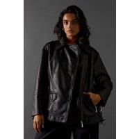Oversized silhouette for a bold, contemporary look Distinctive whipstitch detailing adds edgy flair Asymmetrical zip closure for a modern twist Notched collar and lapels for classic biker style Functional side pockets for practicality Make a statement with this oversized leather jacket from Warehouse. The whipstitch detailing adds a unique touch to the classic biker silhouette, perfect for the confident woman who loves to stand out. Style it with wide-leg trousers and a simple top fo... - Manufacturers part number: Warehouse_5045746996021