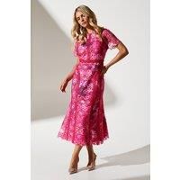 Exquisite jacquard lace pattern throughout Flattering midi pencil silhouette Short sleeves with scalloped edges High neckline with intricate lace detailing Fitted waistband for a defined silhouette Make a striking entrance at your next special occasion with this captivating lace midi pencil dress. The intricate jacquard lace pattern adds a touch of sophistication, while the fitted silhouette accentuates your curves in all the right places. Perfect for weddings, race days, or formal e...