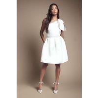 Striking one-shoulder design with statement bow detail Flattering mini length for a modern bridal look Structured silhouette with pleated skirt for added volume Clean, minimalist aesthetic perfect for contemporary brides Versatile style suitable for ceremony or reception Make a bold statement on your special day with this captivating one-shoulder bridal mini dress. The eye-catching bow detail adds a touch of drama and sophistication, while the structured silhouette and pleated skirt ...