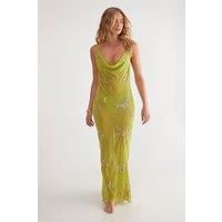 Vacation pending. Feel fierce in our maxi dress, made in high quality mesh fabric, with a stellar silhouette and sexy sheer fabric. Pairs well with sandals and your fave bikini for a poolside look that will turn heads. Premium Hand Embellished Celestial Cowl Neck Maxi Beach Dress High Quality Mesh Fabric Flattering Figure Hugging Fit Flirty Sheer Design Statement Cowl Neckline Head Turning Strappy Back Sparkling Celestial Details Model wears a size S (US size 6/UK size 10).