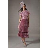 Exquisite lace bodice with intricate floral detailing Elegant high neckline and cap sleeves Tiered pleated skirt for a dramatic silhouette Midi length perfect for formal occasions Satin finish adds a luxurious sheen Make a statement at your next special event with this stunning satin lace tiered dress from Coast. The intricate lace bodice showcases beautiful floral patterns, creating a romantic and sophisticated look. The high neckline and cap sleeves offer a touch of modesty, while ... - Manufacturers part number: Coast_5045748574647