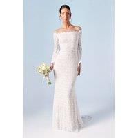 Exquisite lace detailing throughout Elegant off-shoulder Bardot neckline Figure-hugging fishtail silhouette Long sleeves with delicate scalloped edges Stunning train for a dramatic entrance Make a breathtaking entrance on your special day with this enchanting Bardot Boho Lace Fishtail Wedding Dress from Coast. The alluring off-shoulder neckline gracefully frames your dcolletage, while the intricate lace fabric adorns your silhouette with timeless elegance. The form-fitting design cul... - Manufacturers part number: Coast_5045749315843