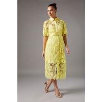 Exquisite lace overlay with intricate floral pattern throughout Elegant collared neckline with button-down front detail Sophisticated short sleeves with scalloped edges Matching fabric belt with statement buckle to define the waist Midi-length hem with delicate scalloped edging This stunning shirt dress combines timeless sophistication with contemporary design. The intricate lace pattern creates a beautiful textural contrast whilst maintaining an air of refined elegance. The classic ...