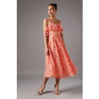 Exquisite lace overlay with intricate pattern detailing throughout the dress Elegant off-the-shoulder design with delicate ruffle trim Flattering fit and flare silhouette that cinches at the waist Wide shoulder straps providing comfortable support Sophisticated midi-length hem perfect for formal occasions This enchanting Coast lace dress captures attention with its romantic off-the-shoulder neckline and feminine ruffle detailing. The carefully crafted fit and flare silhouette creates... - Manufacturers part number: Coast_5045749907611