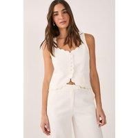 Elegant tailored vest featuring a distinctive scallop embroidered edge for a feminine touch Button-front fastening with decorative round buttons adding a refined detail Sleeveless design with a flattering sweetheart neckline Cropped length perfect for high-waisted styling Subtle stretch in the fabric ensures comfort whilst maintaining structure This Nasty Gal tailored vest reimagines formal dressing with its delicate scalloped edges and structured silhouette. The button-front design creates a sophistica...
