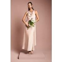 Elegant cowl neckline creates a graceful drape across the dcolletage Luxurious satin fabric with a subtle sheen catches the light beautifully Flowing chiffon drape detail adds movement and romantic flair Sleeveless design offers comfort whilst maintaining a sophisticated silhouette Ankle-length cut with a gentle flare creates an effortlessly elegant profile This stunning Coast bridesmaids dress combines timeless elegance with contemporary design elements. The sumptuous satin fabric c...
