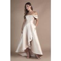 Elegant Bardot neckline with graceful off-shoulder design Dramatic waterfall drape detail creating visual interest and movement Structured twill fabric providing excellent shape retention Full-length silhouette with flattering A-line cut Fully lined for comfort and a flawless drape This stunning Bardot bridesmaid dress from Coast combines timeless elegance with contemporary design. The sophisticated off-shoulder neckline frames the dcolletage beautifully, whilst the waterfall drape detail adds a touch of drama to the silhouette. Crafted from structured twill fabric that holds its shape throughout the celebration, this gown offers both comfort and style for your special role in the bridal party. The A-line cut is universally flattering, creating a graceful silhouette that complements the wedding aesthetic. Style with delicate drop earrings as shown and an elegant updo to showcase the beautiful neckline. Complete the look with strappy heels and a small clutch in a complementary tone to m...
