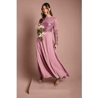 Exquisite embellished bodice with intricate beadwork and sequin detailing Elegant long sleeves with sheer overlay and continuing embellishment pattern Sophisticated high neckline with radiating sunburst design Flowing maxi-length skirt with graceful side split for ease of movement Flattering fitted waistline creating a beautiful silhouette This stunning Coast bridesmaids dress combines timeless elegance with contemporary design elements. The ornate embellished bodice creates a captivating focal point, with intricate beadwork that catches the light beautifully as you move. The sheer long sleeves offer modest coverage whilst maintaining a delicate, feminine aesthetic perfect for wedding celebrations. The flowing skirt drapes gracefully to the floor, with a subtle side split that allows for comfortable movement during the ceremony and dancing afterwards. Style with simple strappy heels and minimal jewellery to let the dress's embellishments take centre stage. For a coordinated bridal part...