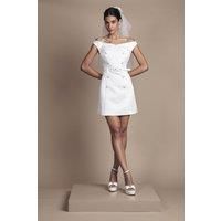 Elegant Bardot neckline showcasing dcolletage with sophisticated off-shoulder design Structured fit and flare silhouette creating a flattering feminine shape Decorative button detail adding a tailored, contemporary twist Matching belt to accentuate the waistline for a defined silhouette Mini length offering a modern approach to bridal style This striking Coast mini wedding dress presents a contemporary vision for the modern bride who desires both elegance and individuality. The sophi...